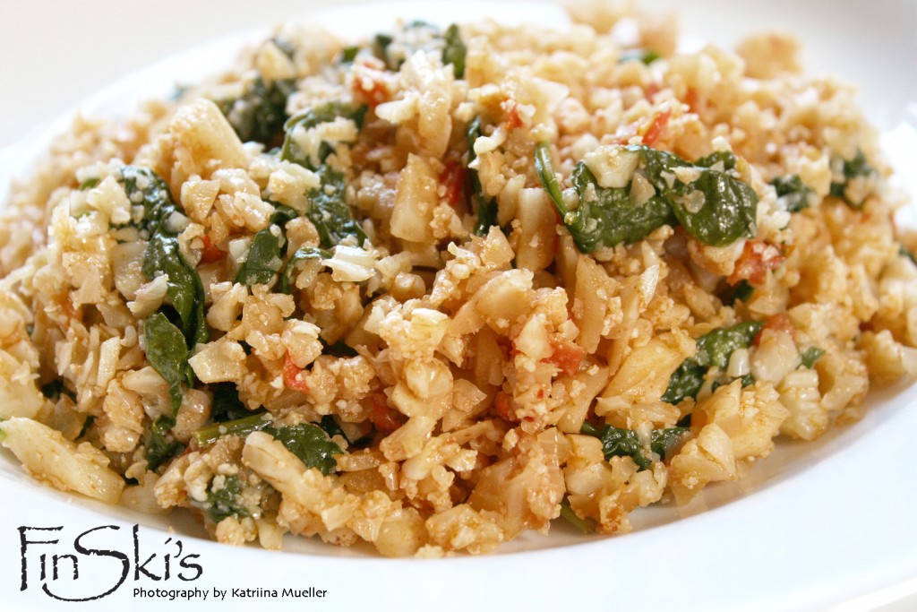 Add the spice mix and turmeric, stir to combine. Add the the coconut milk, the cauliflower florets and the diced tomatoes and cook for about 15-20 mins on a low simmer or till the cauliflower is tender and the sauce has thickened slightly